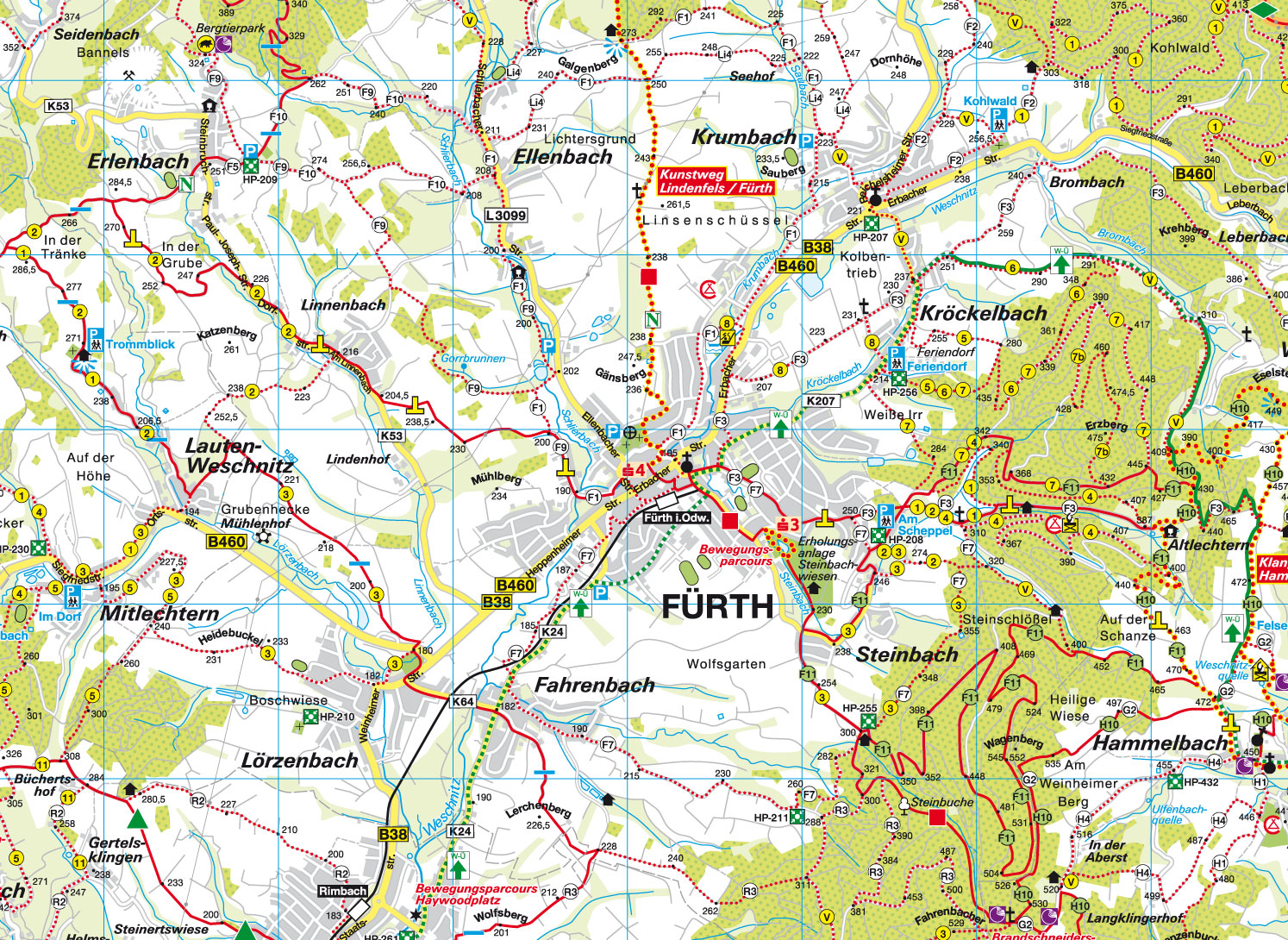 dieser Karte im Maßstab 1:35.000 sind die Kunstwege und Bewegungsparcours der Sparkassenstiftung